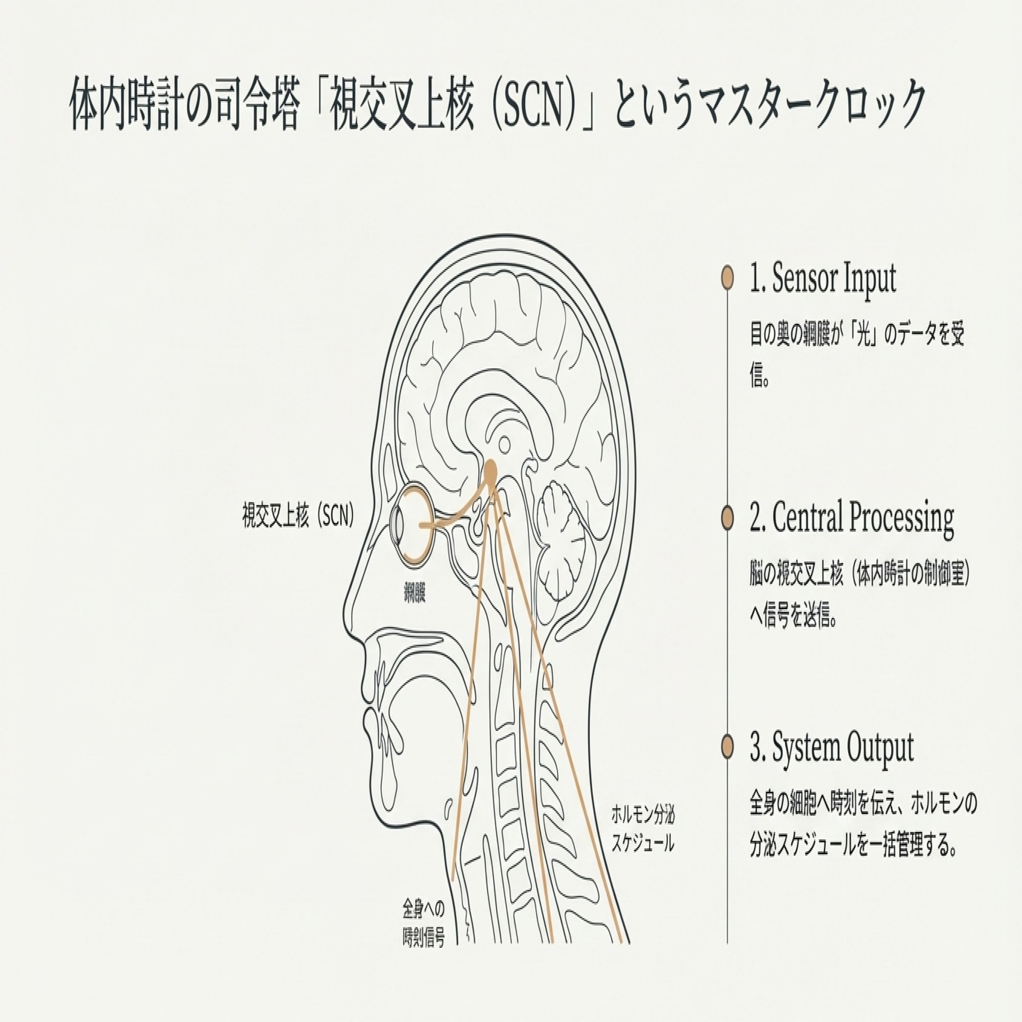 目の奥の網膜が受け取った光の情報は、脳の「視交叉上核(しこうさじょうかく)」という部位に届きます。ここが体内時計の制御室です。