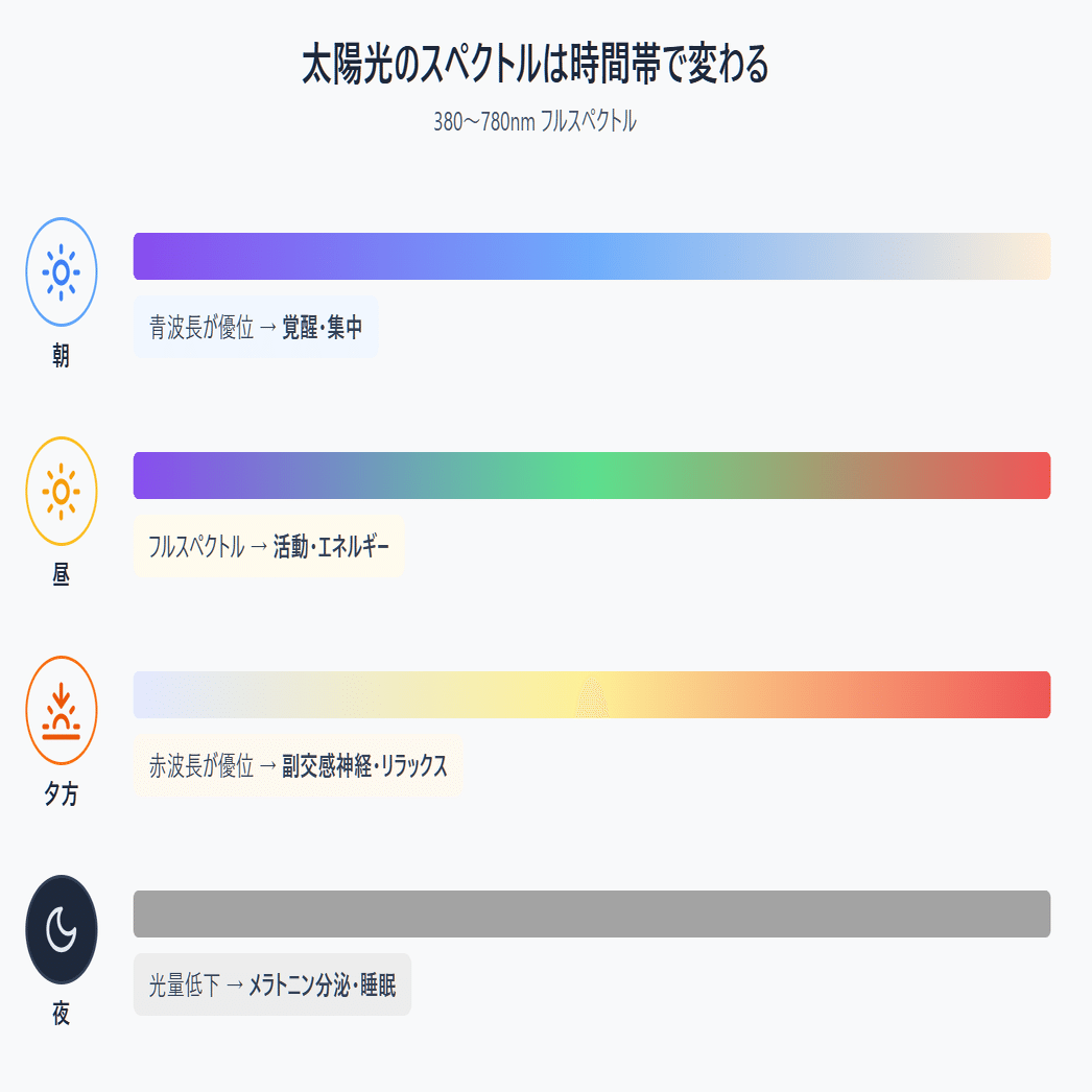 太陽光は「380〜780nmのフルスペクトル光」です。さらに時間帯によってスペクトルが変化します。